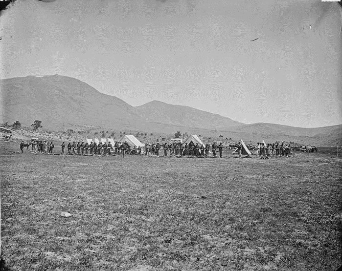 Subject: Sunday morning inspection at Redezvous Camp near Belmont, Nevada in 1871