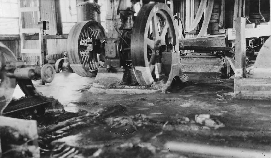 Subject: Aftermath of a flood in Beatty, Nevada, showing flood damage and water levels on machinery inside the mill owned and operated