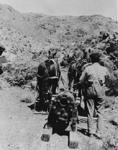 Subject: Horses pulling part of either a compressor or an engine up the trail to Joshua Irving Crowell's mine at Chloride Cliff in the