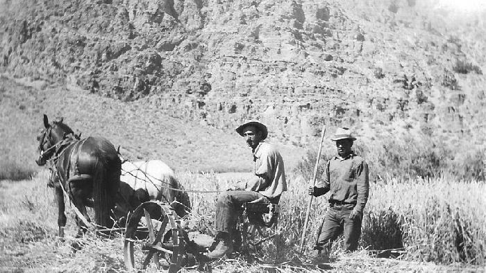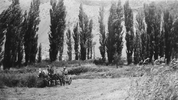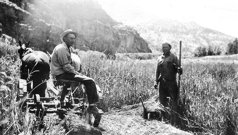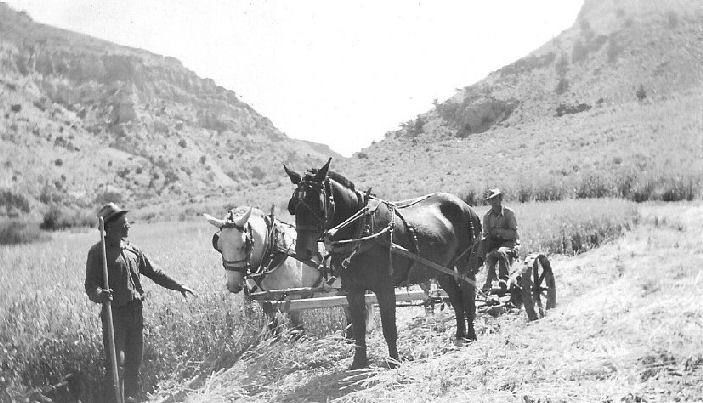 Subject: Titus-Locke Ranch, Moore's Station, Hot Creek Valley - Melvin Filippini mowing 5 1/2 ft. tall crop of Reed's Canary