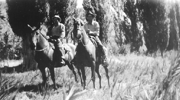 Subject: Bonney Ornelas and Melvin Philippini riding fine saddle horses used in ranch operations.