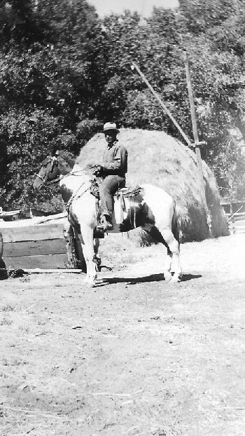 Subject: Pinto stallion -- Bonney Ornelas up. Newly stacked wild hay. August 17, 1943