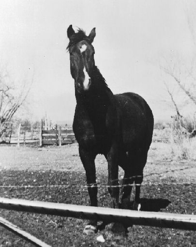 Subject: Young stallion named Snit belonging to John Hughes on the Pahrump Ranch, about 1938. The horse was a mustang and was caught on the open range in the Pahrump Valley.