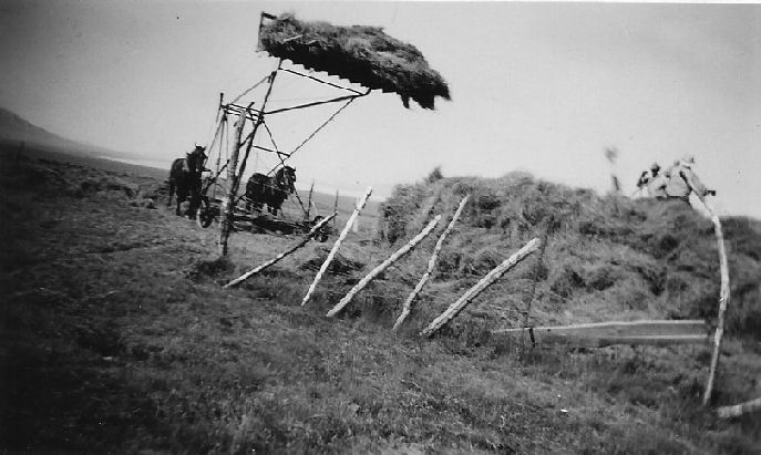 Subject: First Cutting Alfalfa - Bruce Larsen, Victory Farm Volunteer, of Manhattan, bucking hay into stack on Will