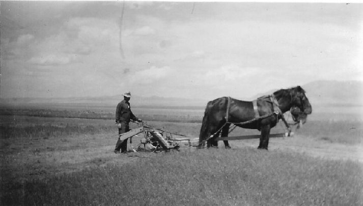 Subject: G.M. Carver Ranch - Smokey Valley - Carver mowing cheat grass on his ranch. - June 12, 1944 - C.E.B.
