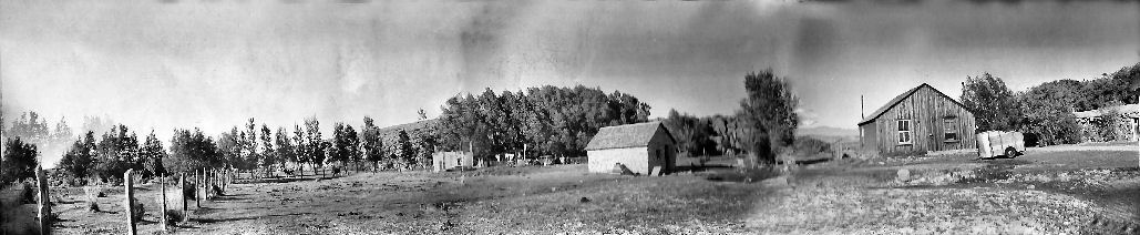 ranch buildings on Clifford Ranch. -- Original Stone Cabin is at right of picture. Ranch Home is in center of picture