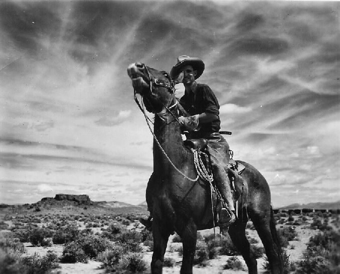 Subject: Joe Clifford Ranch - Stone Cabin Valley - Marguerite Clifford Boscovich, top cow girl up on "Baldy". She takes