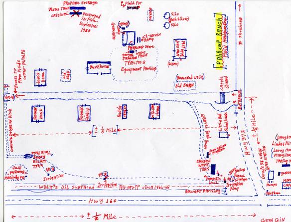 MW: Certainly. That was a source of great pride for my dad. You’ve seen the photo of him standing next to his ’64 copper-colored Chevy Impala on that air strip. His expression is such as to show the quality of something he was very proud of. I don’t remember exactly what year it was, but it would have been in 1964 or 1965 and he made available that portion of land. It wasn’t being farmed anyway; it was bare ground that lay between Highway 160 and the camp, as it were, in the corner near Highway 372 where the No. 1 irrigation and domestic wells were. That’s where airplanes could be tied down. And from there, the runway continued parallel alongside Highway 160 for a considerable distance, with the camp area and fields on the opposite side.