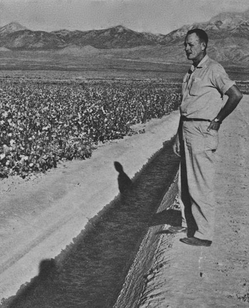 Walt Williams, owner of the Pahrump Ranch, standing by irrigation ditch in a cotton field, Pahrump Ranch, Pahrump, Nevada, May 1957. Courtesy Mark Williams.